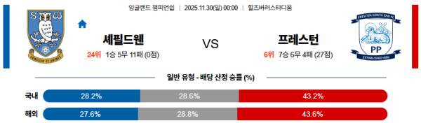 (축구) [토지노월드]11월30일 셰필드웬즈데이:프레스턴 잉글랜드챔피언쉽 분석