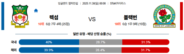 (축구) [토지노월드]11월30일 렉섬:블랙번 잉글랜드챔피언쉽 분석